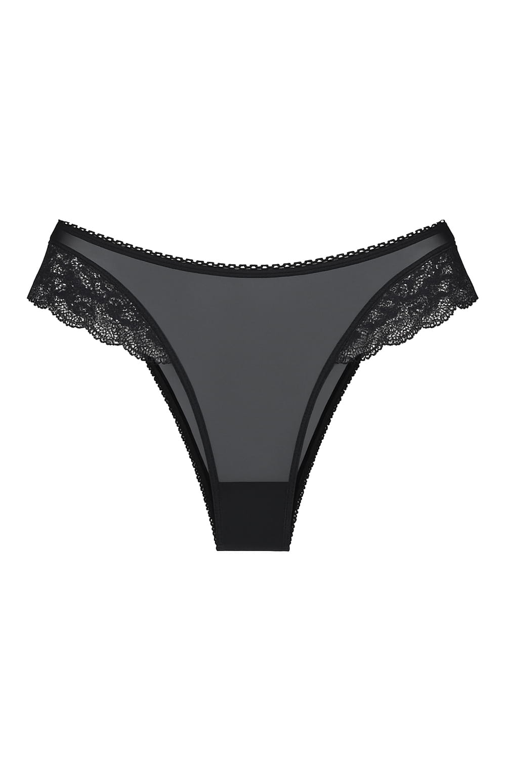 Figi koronkowe wykonane z czarnej elastycznej siateczki obszyte czarną koronką ze srebrnymi listkami.